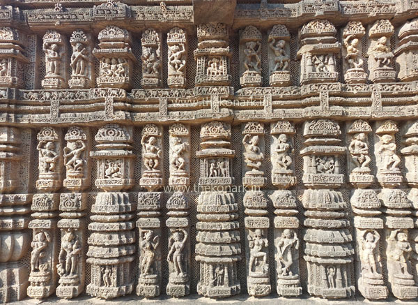 The Natamandira is not a closed hall, on each of the four sides, there are four pillars. In the central part of the floor are four large square pillars. The openings in the east and west are in perfect alignment to take the Sun rays of the rising Sun into the Jagamohana and the garbhagriha. The floor of the Nata Mandapa is reached by spacious openings in the center of the four sides, each opening is approached by a flight of four steps. The rows of pillars divide the floor of the Nata Mandira into nine compartments, probably indicating some association with the nine planets. The four central pillars have five divisions. The lower division is fairly pain and not craved. The central and top divisions are craved with different figures of female musicians, female dancers, devotees and lion vyalas.